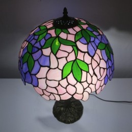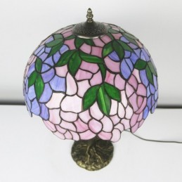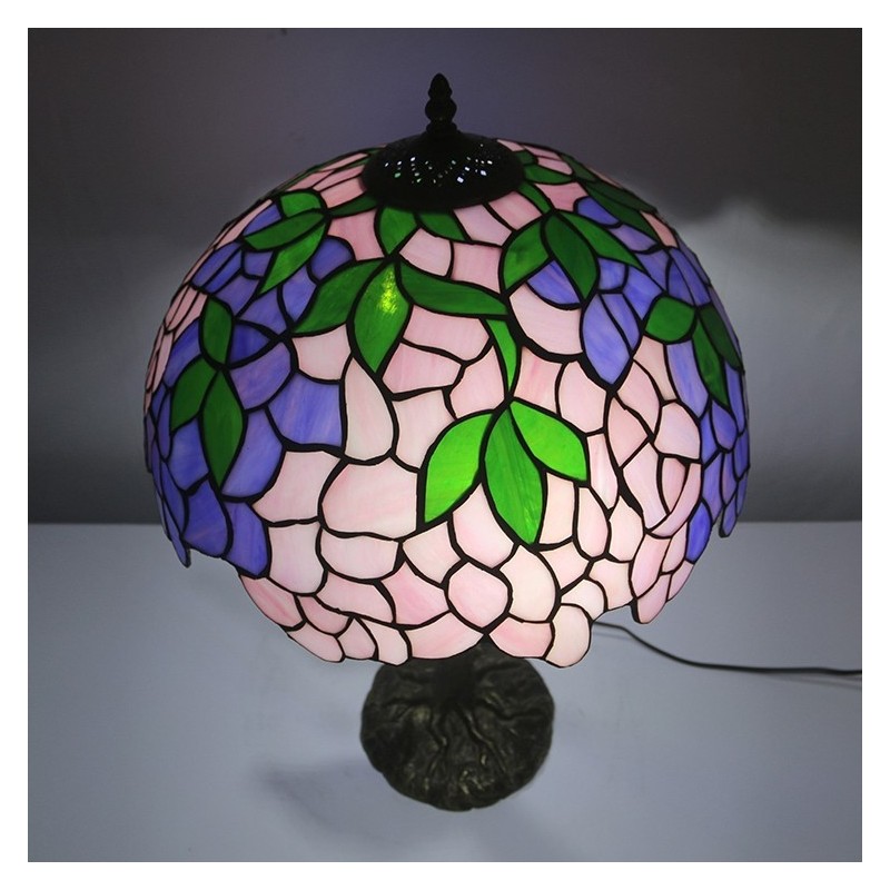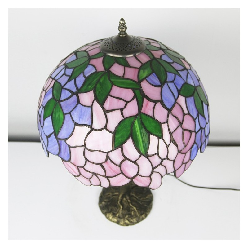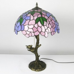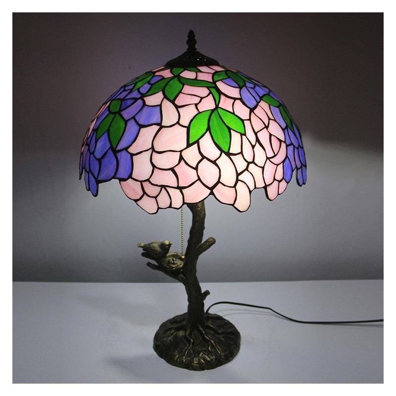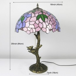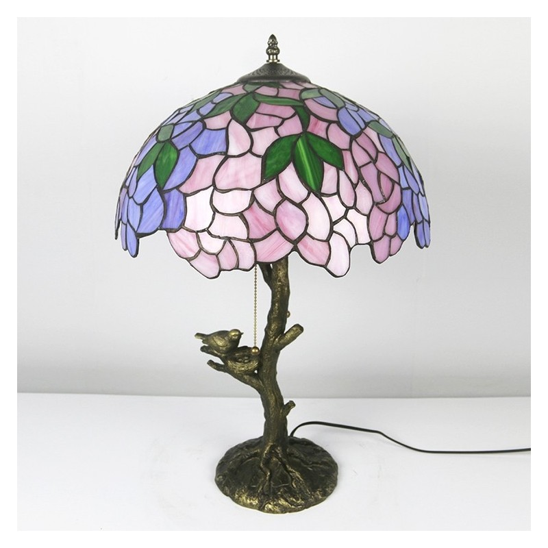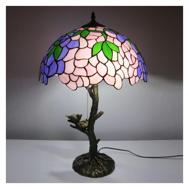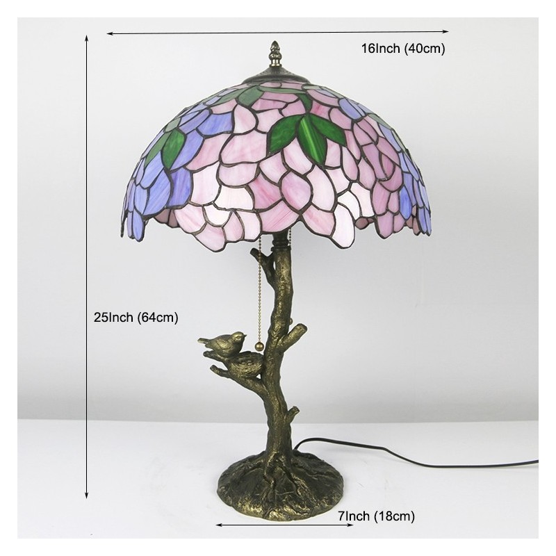 Pink Wisteria Tiffany Style Stained Glass Table Lamp With 16 Inch Wide Lamphade And Bird Nest Tree Trunk